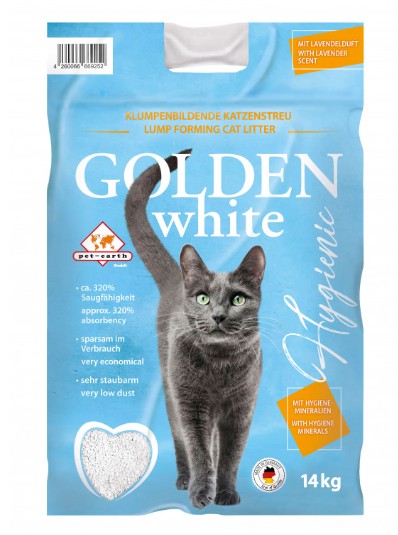 Golden White arena aglomerante: Esta arena para gatos Golden White está compuesta de bentonita blanca con perfume suave a lavanda.